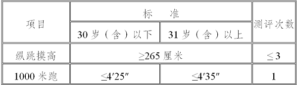 1、项目和标准。本次体能测评项目为二项,分别为纵跳摸高、1000米跑,相关标准参照《公安机关录用人民警察体能测评项目和标准(暂行)》(人社部发〔2011〕48号)进行。