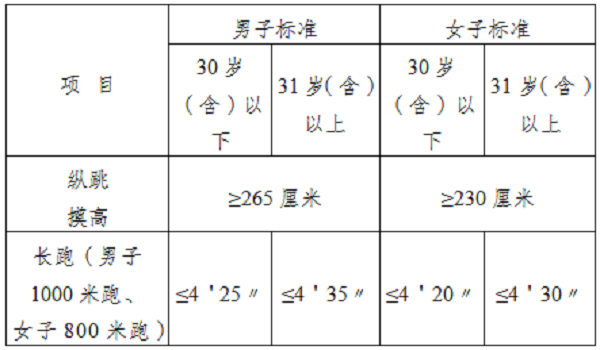2.体能测评项目及标准。本次招聘体能测评共两项:男子为纵跳摸高、1000米跑;女子为纵跳摸高、800米跑。体能测评标准参照《公安机关录用人民警察体能测评项目和标准(暂行)》执行。