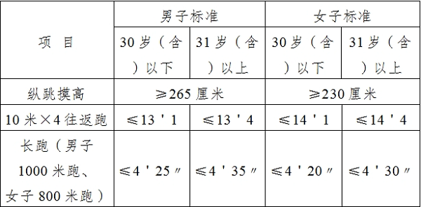(二)结果判定。体能测评先进行纵跳摸高和10米×4往返跑,最后进行长跑;考生需全部通过3项测评方为体能测评合格,其中:纵跳摸高测评不超过3次、10米×4往返跑不超过2次、长跑测评1次;凡其中一项在规定测评次数内未达标的,不再进行后续项目测评,体能测评结果为不合格。