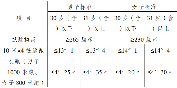 (二)结果判定。考生需一次性通过三项测评方为体能测评合格,其中:纵跳摸高测评不超过3次、10米×4往返跑不超过2次、长跑测评1次;凡其中一项在规定测评次数内未达标的,不再进行后续项目测评,体能测评结果为不合格。