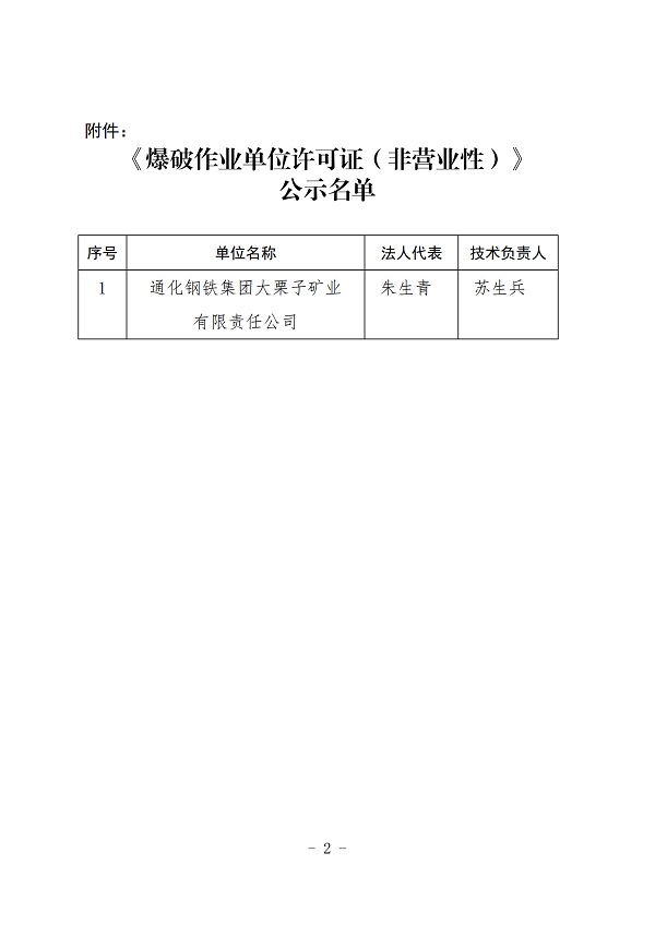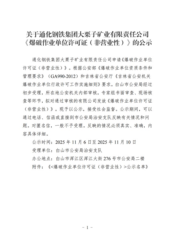 关于通化钢铁集团大栗子矿业有限责任公司《爆破作业单位许可证(非营业性)》的公示