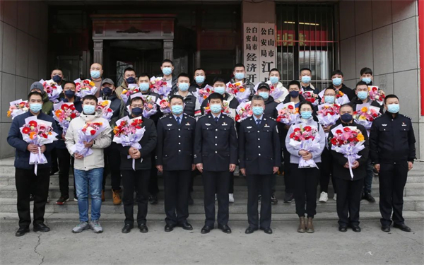 2月26日上午11时许,一场气氛热烈的欢迎仪式在江北公安分局门前隆重举行。白山市浑江区副区长、市公安局党委委员、江北分局局长孙世明带领分局党委班子成员,为“2.10”专案组民警们送上了鲜花和掌声,祝贺他们顺利凯旋。