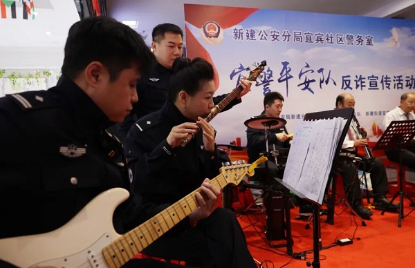 辖区百姓平安幸福是每一位社区民警的最大心愿,为了进一步筑牢社区安全防线,孙源与社区居民委员会、合唱团积极沟通协调,充分发挥文艺优势,由公安蓝盾乐队与社区合唱团联合,定期在社区开展小型文艺演出活动,邀请群众积极参与,队员们化身成治安防范的组织员、情报信息的通信员、矛盾纠纷的调解员、便民利民的服务员、法治教育的宣传员,进行文艺表演的同时倾听群众心声,收集民生民意,排查矛盾纠纷,开展反诈、消防等安全防范知识宣讲。