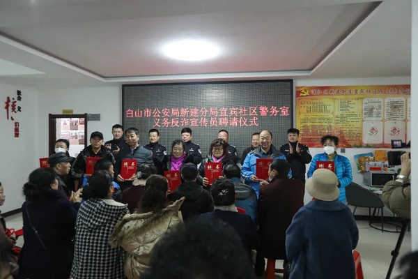 据统计,今年5月至今,宜宾社区共组织各类文艺活动20余场次,参与人数达3000余人次,累计发放各类宣传单8000余张,队员主动发现并化解矛盾纠纷10余起,辖区内未发生一起电信诈骗案件。11月16日,宜宾社区警务室内举办了简短隆重的聘用仪式。在原有“警地融合”警务助办机制基础上,正式将合唱团成员列入警务助办员队伍。新建分局局长逄大阳为他们带上了治安防控的红袖标,并发放聘书。