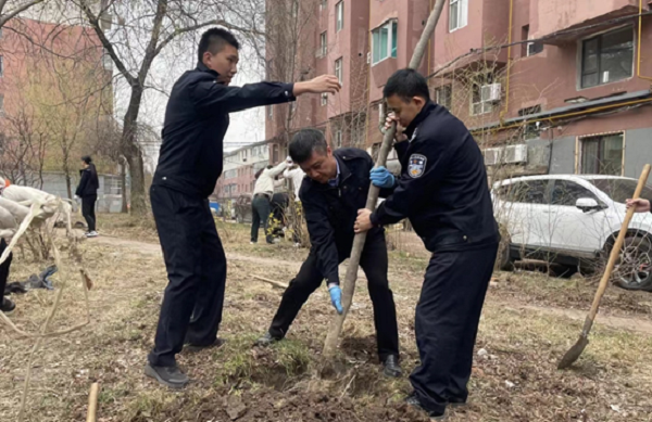 活动中,民警与社区工作者充分发扬不怕脏、不怕累的精神,配合默契,共同栽种树苗。大家二人或三人一组,有的挥锹培土,有的固苗夯土,有的扶树浇水,每一道流程均衔接有序。大家干劲十足,齐心协力为树“安家”,让小区环境绿意盎然。