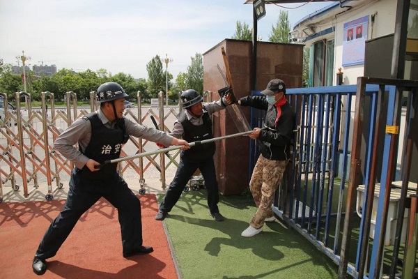 演练开始,一名由学校工作人员饰演的“歹徒”翻越栅栏冲入学校操场,试图伤害正在操场运动的学生。学校保安发现该情况后,第一时间按下一键报警装置,在迅速组织学生们撤离的同时,两名保安立即使用防暴器械与“歹徒”展开周旋,并大声呼喊警示,在协同配合下成功将“歹徒”制服。