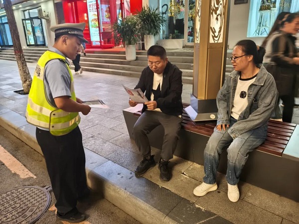 “您好,在K歌欢乐的同时一定要远离毒品”“大爷大娘,平时不要被小礼物等小恩小惠所迷惑,防止被骗”“出行一定要走斑马线,头盔、安全带是出行切实“带”好它”......巡逻民警化身宣传员不断向身边百姓进行安全宣传教育。