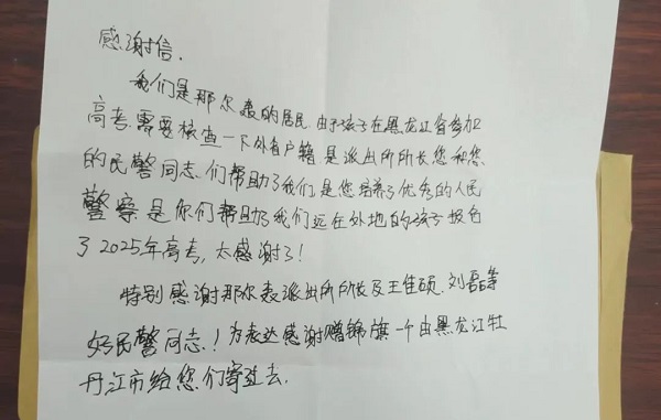 9月18日上午,靖宇县公安局那尔轰派出所收到了张先生送来的锦旗和感谢信,感谢民警及时帮助其儿子补齐了所有2025年高考报名所需的材料。