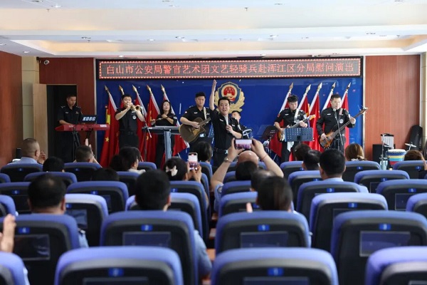 歌声嘹亮激荡强警力量,旋律激昂唱响时代强音。9月19日,白山市公安局警官艺术团文艺轻骑兵带着市公安局党委的深切关怀,深入浑江区分局江北派出所,为坚守一线的公安民辅警带来了一场主题鲜明、精彩纷呈的慰问演出。此次演出是市公安局党委落实从优待警、丰富警营文化生活的重要举措,旨在通过文艺力量传递组织关怀,缓解基层民警辅警工作压力,进一步凝聚警心、激励斗志。浑江区江北街道工作人员积极参与活动组织与现场互动,共同营造了警民同心、暖意融融的良好氛围。