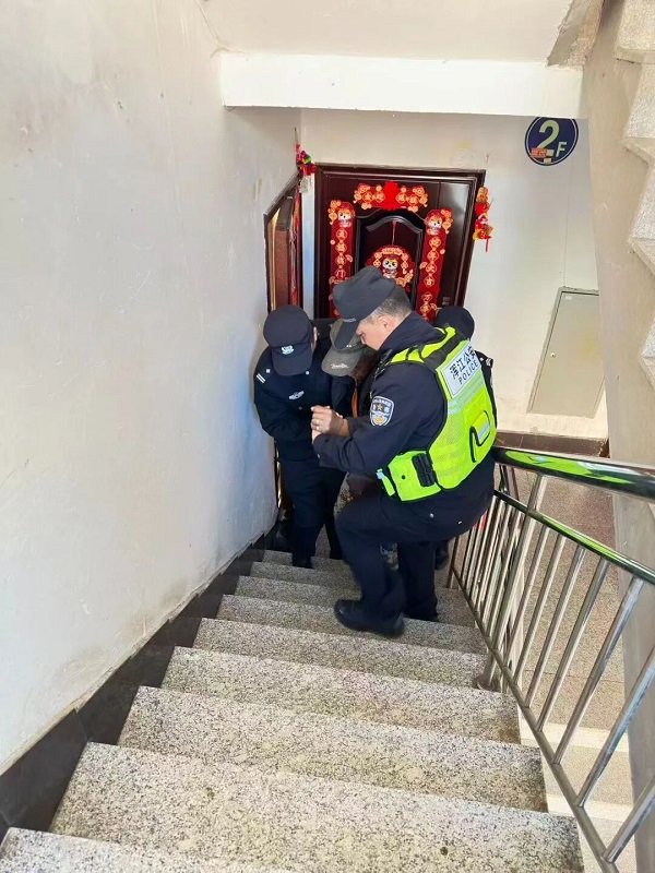 待老人状态稳定一些后,民警耐心向老人询问其家庭住址,随后民辅警轮流搀扶着老人走上5楼,将老人安全送回家中。