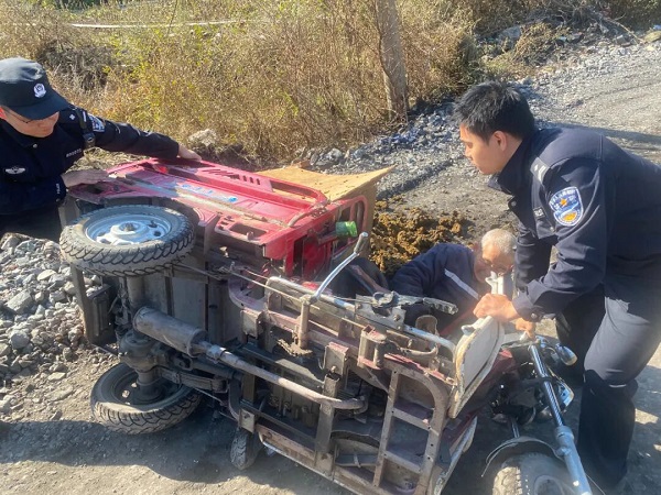 10月23日,通沟派出所民警在侦查案件返回派出所途中,行至原金刚砂厂附近时,发现前方道路旁有一辆三轮车侧翻在地,一位老人被压在车身下,无法起身。见此情景,民警立即靠边停车,快步上前查看情况。