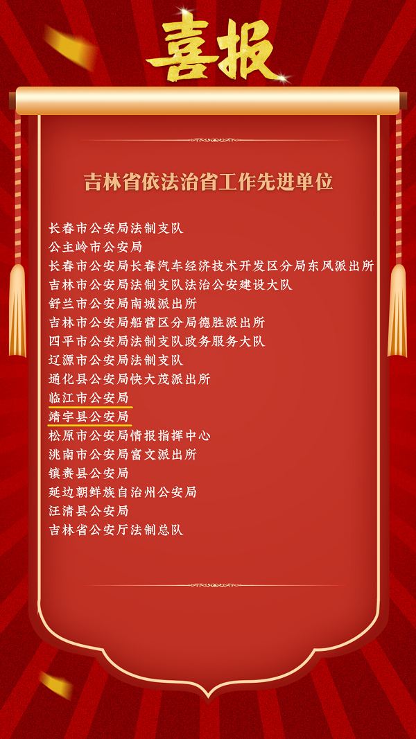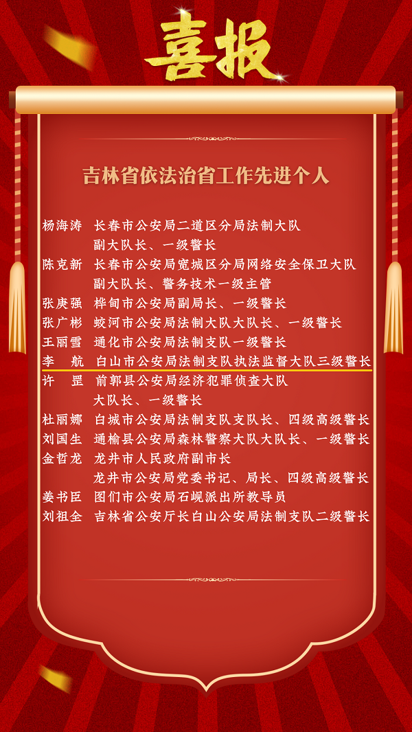 为表彰先进、树立典型,激发广大法治建设工作者责任感使命感,省委、省政府决定授予100个集体“吉林省依法治省工作先进单位”称号,授予198名个人“吉林省依法治省工作先进个人”称号。白山公安系统2个集体、1名个人榜上有名。希望受到表彰的先进集体和先进个人,充分发挥示范引领作用,再接再厉、再立新功,为建设更高水平法治吉林贡献智慧和力量。