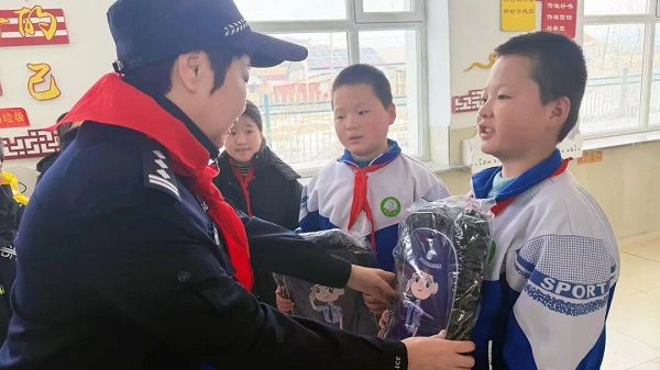 除了为孩子们搭建倾诉平台,此次活动还承载着靖宇县公安局龙泉派出所对学生的深切关怀。活动中,宋海英为学生代表送上了“警察妈妈”定制书包。书包上的警察卡通形象栩栩如生,既承载着“警察妈妈”的美好祝福,更象征着一份永不缺席的守护。接过书包的孩子们,眼中满是惊喜与感动,紧紧抱着这份特别的礼物,与“警察妈妈”相拥在一起。这份暖心礼物,为孩子们的校园学习提供了便利,让他们在成长路上真切地感受到了“警察妈妈”的温暖与力量。