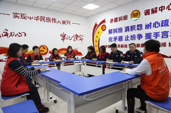 长春市公安局朝阳分局重庆路派出所民警与社区网格长、网格员共同研究平安社区建设工作。孙康 摄