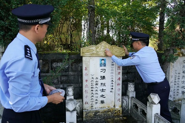 怀着这份崇敬,民警们俯身于墓碑前,细致地擦拭碑体,认真清理墓周环境,动作间满含追思,以质朴的劳动表达对英烈的深切缅怀。全体人员向烈士墓行举手礼,并依次献上鲜花,驻足瞻仰。整个仪式肃穆凝重,充满了对公安英烈的无限哀思与崇高敬意。
