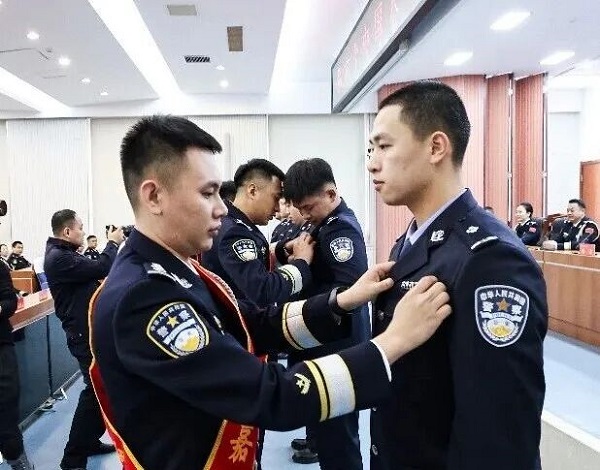 仪式在全体奏唱《中国人民警察警歌》中拉开帷幕,仪式现场宣读《奖励命令》,市局领导班子成员为立功嘉奖民警代表颁发奖章、证书、为2026年即将荣休民警代表、2025年新入警民警代表颁发纪念杯,由受到表彰奖励民警代表为新入警民警代表佩戴警号。